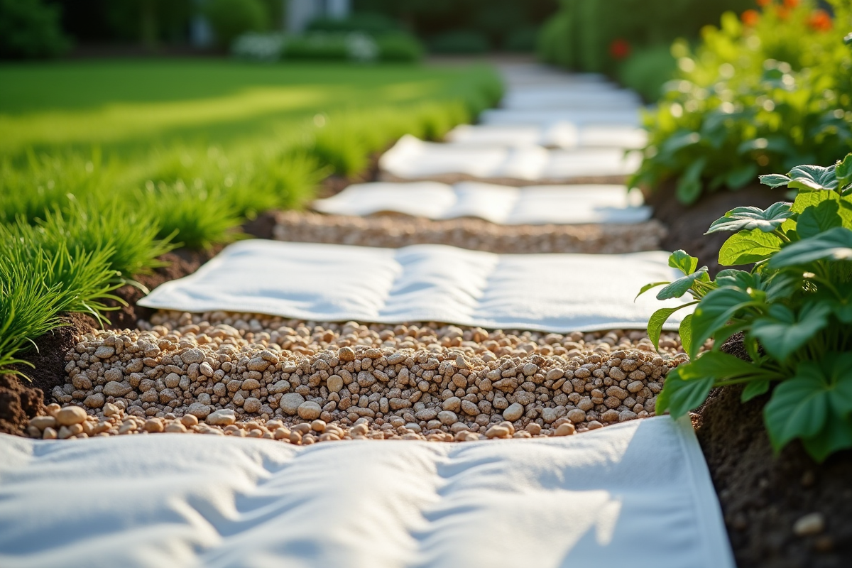 Le géotextile s’est imposé comme l’allié discret mais décisif des extérieurs bien conçus. Entre la terre et le gravier, ce film technique joue plusieurs rôles de première importance. Sa première utilité : bloquer l’invasion des herbes indésirables qui, sans barrière, s’invitent à travers la couche de graviers et dégradent rapidement l’aspect du jardin. La toile géotextile agit comme un filtre : l’eau s’infiltre, préservant le drainage, mais la lumière ne passe plus, freinant la germination des adventices.