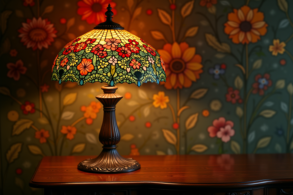 Les lampes Tiffany se distinguent par leur esthétique raffinée et leur technique de fabrication méticuleuse. Chaque pièce est conçue à partir de verre favrile, une invention de Louis Comfort Tiffany qui donne au verre une texture et des couleurs iridescentes uniques. Ce procédé permet de créer des effets de lumière et de couleur qui transforment chaque lampe en une œuvre d’art vivante.