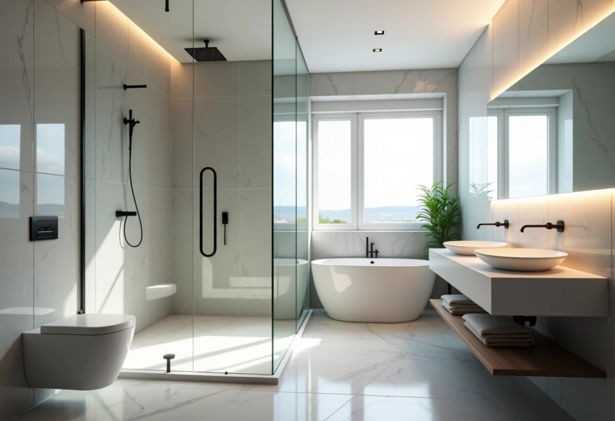 Le choix des matériaux et équipements impacte directement l’esthétisme et la valeur de votre maison. Optez pour des matériaux durables et élégants, comme le marbre ou le carrelage en grès cérame. La robinetterie en noir mat ou en laiton ajoute une touche contemporaine et sophistiquée. Pour les équipements, considérez des options comme :