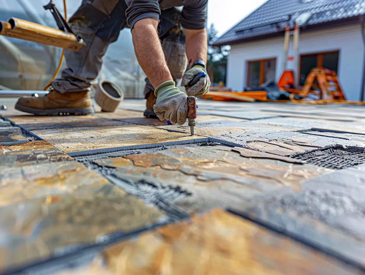 Couvreur posant des tuiles en terre cuite sur un toit résidentiel